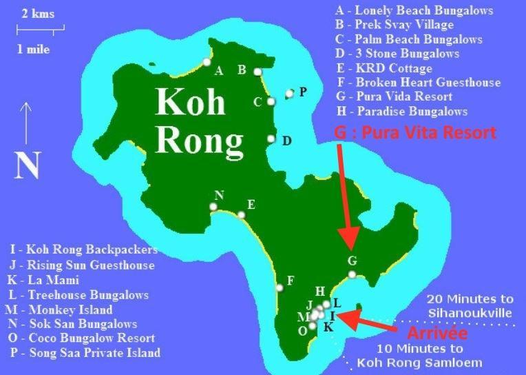 Transfert PAR vos soins : C'est simple : vous prenez un bateau rapide pour 20 ou 25$/pers, vous arrivez au ponton 21 et sur la plage vous tournez à droite et faite 300m. Voir en bas de cette page